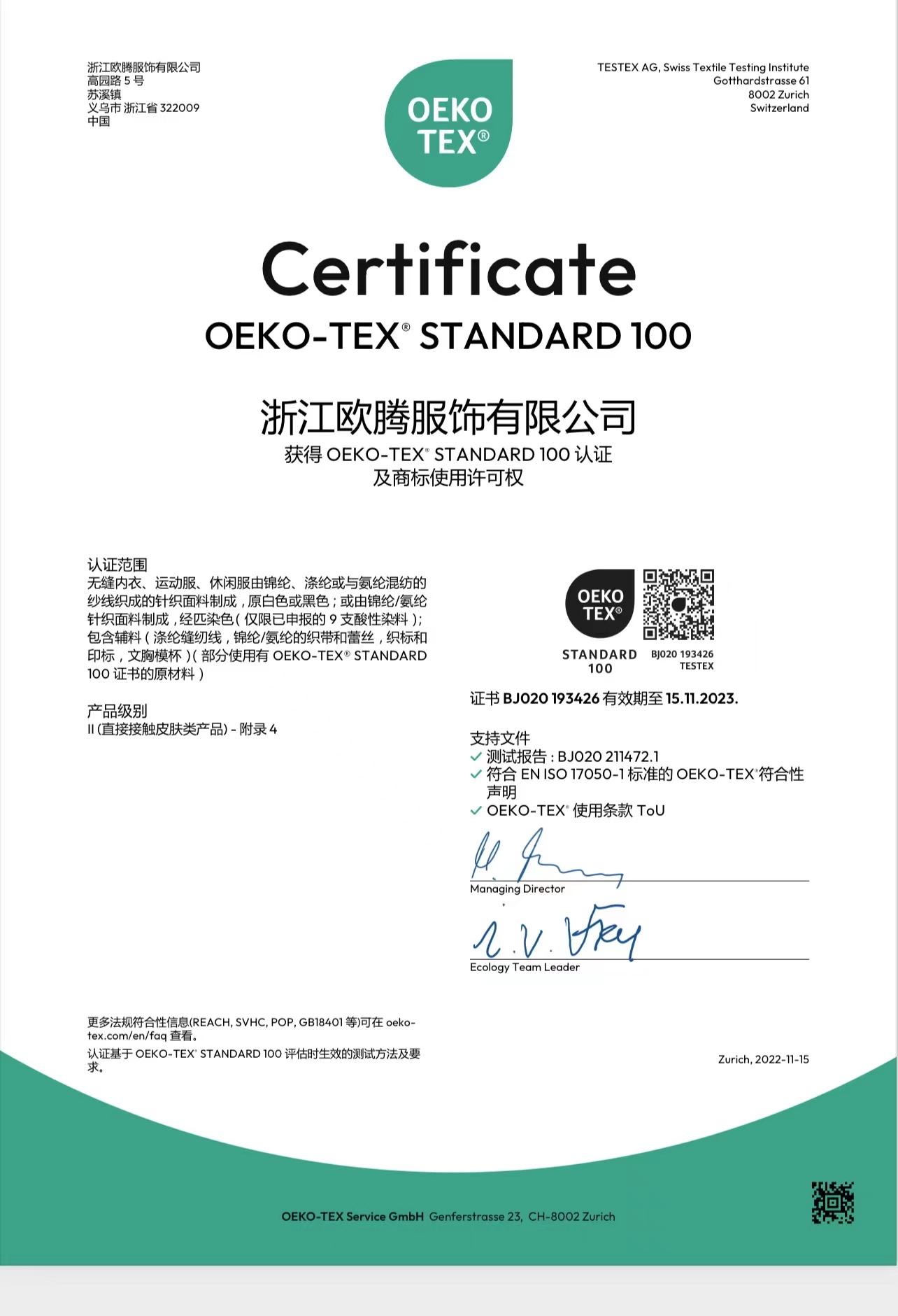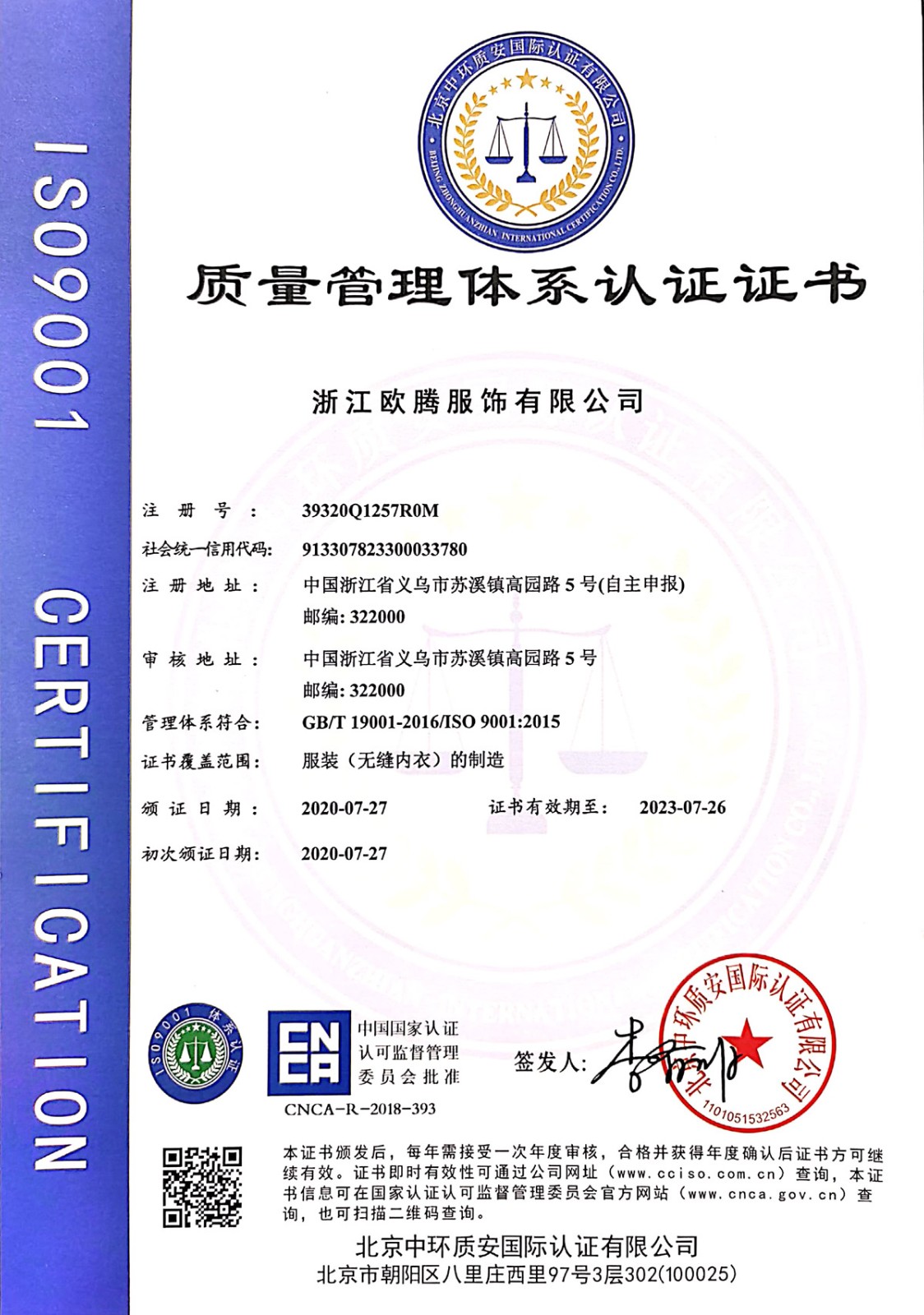 浙江歐騰服飾有限公司位于世界小商品之都-義烏。創(chuàng)立于2015年,是一家專業(yè)生產(chǎn)無縫針織運(yùn)動(dòng)服飾和內(nèi)衣的工貿(mào)一體企業(yè),擁有自主出口權(quán)。 工廠的占地面積約16000平方米 ,引進(jìn)了大型圣東尼、高騰等多種先進(jìn)的制衣設(shè)備300余臺(tái)。月產(chǎn)能可達(dá)90萬件。 歐騰服飾每年投入近百萬資金打樣開發(fā)新產(chǎn)品,有著一支高素質(zhì)設(shè)計(jì)、技術(shù)員工隊(duì)伍。工廠先后通過了ISO 9001質(zhì)量管理體系認(rèn)證、BSCI認(rèn)證、GRS認(rèn)證、OEKO-TEX國際生態(tài)紡織品認(rèn)證等多項(xiàng)專利檢測報(bào)告。可提供OEM&ODM服務(wù)。歐騰服飾以一套完整、科學(xué)的質(zhì)量管理體系,生產(chǎn)的服裝從原材料紗線到成衣,質(zhì)量完全能夠滿足國內(nèi)、國際質(zhì)量要求。獲得了客戶一致好評(píng)。工廠先后獲得省科技型企業(yè)、國家高新企業(yè)、義烏市誠信講信用單位、規(guī)上企業(yè)、信用AAA級(jí)等榮譽(yù)。